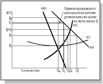Рис.7 показывает эффект регулирования цен. Рm и Qm - соответственно цена и объем производства на нерегулируемом монопольном рынке. Теперь предположим, что государственное регулирование определяет максимальную цену Р1 . Так как фирма может установить цену не выше Р1 для объема производства Q1 , ее новая кривая среднего дохода представляет собой горизонтальную линию на уровне Р1 . Для уровней объема производства выше, чем Q1 , новая кривая среднего дохода совпадает со старой кривой среднего дохода, потому что при этих объемах производства фирма назначит цену ниже Р1 и на нее никак не повлияет регулирование.