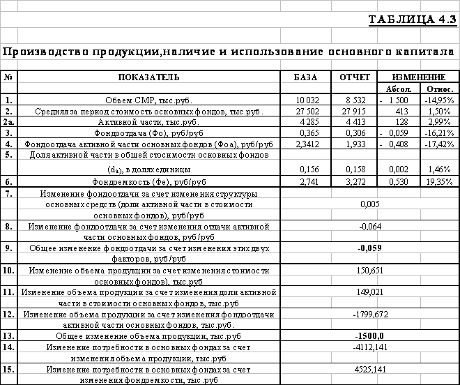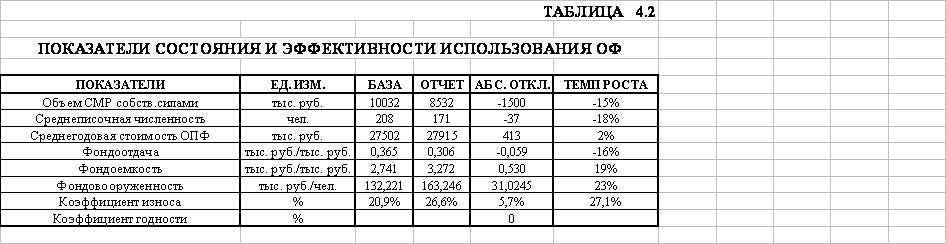 Для характеристики степени использования основных фондов рассчитываются показатели фондоотдачи и фондоемкости. Для характеристики технической оснащенности строительных рабочих и ее влияния на уровень использования основных фондов рассчитываются показатели фондовооруженности, механовооруженности и энерговооруженности труда рабочих. Анализ состояния основных фондов производится на основе вычисления коэффициентов износа и годности (см. табл.4.2)