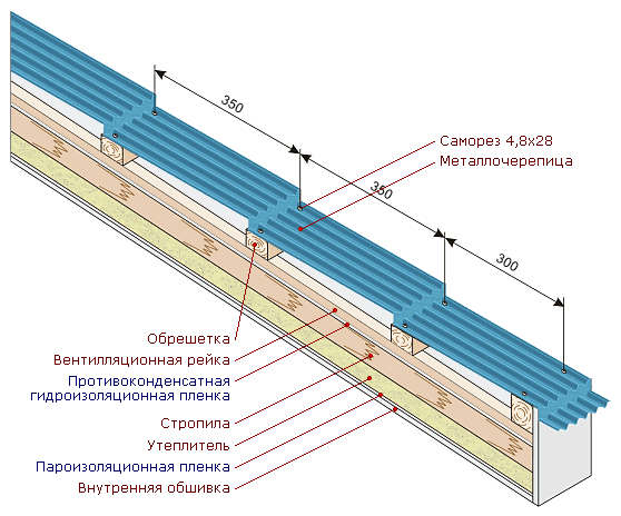 Металлочерепицу крепят саморезами 4,8х28 (для древесины) в прогиб волны профиля. Расход саморезов 8 штук на квадратный метр. Место наращивания крепят к обрешетке в прогибе каждой волны. На гребне и карнизе саморезы ввинчивают в прогиб каждой второй волны. Боковой нахлест закрепляют саморезами 4,8х65 мм в гребень волны. При этом нельзя допускать деформации поверхности профиля.