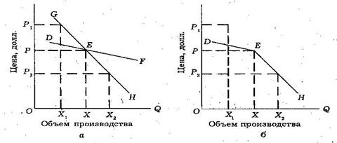 Предположим, что у фирмы цена за единицу продукта ОР, а объем продаж ОХ (рис. 3, а), DEF — кривая спроса на товары фирмы- Она принимает решение повысить цену на свои товары. Новая цена ОР1 Другой вариант: она понижает цену до ОР2. Предположим далее, что соперники следуют за фирмой при установлении цен. В таком случае GЕН представляла бы кривую спроса фирмы, совпадающую с кривой спроса ее соперников. На практике же, если фирма поднимает цену, соперники не следуют за ней и не повышают цену, с тем чтобы увеличить свою долю рынка за счет фирмы. Если фирма понижает цену, соперники реагируют на такое сокращение, с тем чтобы предотвратить потерю своей доли рынка. Таким образом, завершающая кривая спроса составляется из двух сегментов DЕ и ЕН с переломом в точке Е. Сотрем отрезки СЕ и ЕЕ и получим ломаную кривую спроса в данной отрасли DЕН (рис. 3, б). Фирмы не реагируют на повышение цен и снижают цены вслед за снижением цен одной из них.