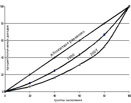 Одним из наиболее известных способов измерения этого неравенства является построение кривой Лоренца, названной так по имени американскою экономиста и статистика Макса Лоренца. Кривая Лоренца отражает неравномерность распределения совокупного дохода общества между различными группами населения. (Рис 1) По горизонтали отложены процентные группы населения, а по вертикали - проценты дохода, получаемые этими группами. Если бы в распределении доходов существовало абсолютное равенство, то 20 % населения получали бы 20 % от всего совокупного дохода общества, 40 % населения — соответственно 40 % дохода, 80 % населения — 80 % дохода и т.д Чем сильнее изогнута кривая Лоренца, тем менее равномерно распределены доходы. Построим кривые Лоренца характеризующие неравенство в распределении доходов для Советского Союза в 1990 году и России в 2005 году.
