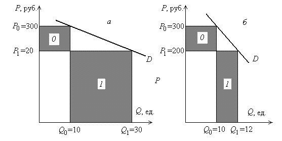 Рис. 1, б графически иллюстрирует пример неэластичного спроса. Снижение цены на 100 руб. (с Р0 до Р1) увеличит величину спроса лишь на 2 ед. При этом выручка от реализации упадет с 3000 (300×10) до 2400 руб. (200×12). Естественно, что при такой ситуации фирма не будет снижать цену своей продукции, не без основания опасаясь снижения своих доходов [Л8, с. 89].