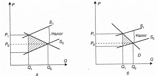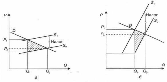Рис. 6. Распределение налогового бремени при эластичном (а) и неэластичном (б) спросе: D — спрос; S0, S1, — предложение до и после введения налога [Л1, с. 199].