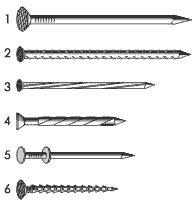 1. Гвозди строительные 2. Гвозди проволочные со стержнем периодического профиля 3. Гвозди квадратно-винтовые 4. Гвозди с винтовой накаткой "сюрприз" 5. Гвозди с двумя головками 6. Гвозди с треугольной насечкой |