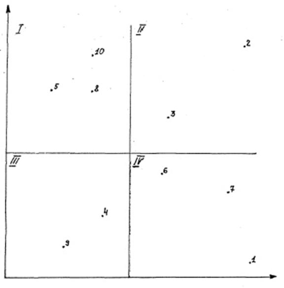 Положение в III квадрате №№ 4, 9 является самым оптимальным, т.к. не несет высокого ущерба и вероятность возможного случая мала.
