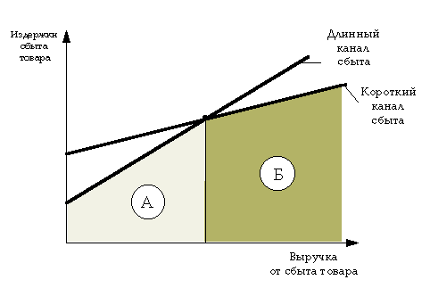 А — зона эффективности длинного канала сбыта товара с оптимальным количеством посредников; Б — зона эффективности короткого канала сбыта с наименьшим количеством посредников.