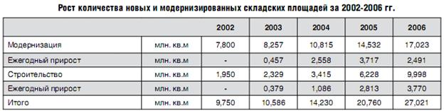 Таблица Б.1 – Рост количества новых и модернизированных складских площадей за 2002-2006 гг.