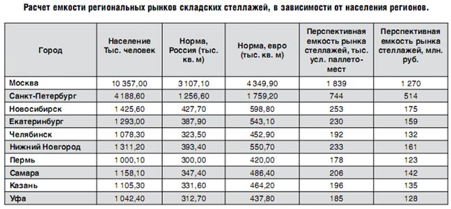 Таблица Б.8 - Расчет емкости региональных рынков складских стеллажей, в зависимости от населения регионов