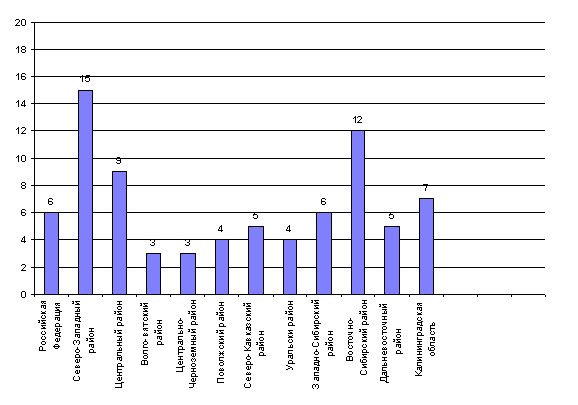 По данным Госкомстата России треть общего количества малых предприятий сосредоточена в Центральном районе, при этом в Москве - 22 %, Санкт - Петербурге - 11 %, Московской, Тюменской областях - по 4 %, Краснодарском крае и Свердловской области - по 3 %, по 2 % - в Новосибирской, Ростовской, Самарской, Кемеровской, Нижегородской областях, Краснодарском крае, Республике Татарстан. В то же время в таких субъектах Российской Федерации, как Ингушская Республика, Республика Тыва, количество малых предприятий не превышает одной тысячи. Если в среднем в 2001 году по стране на 1000 человек приходилось 6 малых предприятий, то в Москве - 21 предприятие, в Санкт - Петербурге - 19,10 - в Тюменской области, 9 - в Республике Алтай. В Республике Дагестан на 1000 человек постоянно проживающего населения действовало лишь одно малое предприятие.