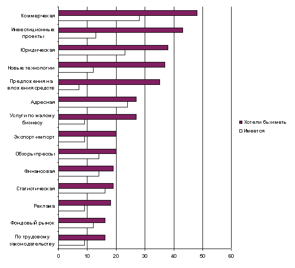 Имеющаяся у предпринимателей информация в большей степени касается (коммерческой), адресной (24%) и юридической (24%), а также статистической, однако до сих пор потребность в коммерческой и юридической информации считается неудовлетворительной, так как ее хотят иметь 47% и 39% соответственно (рис.2.2). Появление таких потребностей, как информация об инвестиционных проектах, новых технологиях и предложениях на вложение средств свидетельствует о серьезных изменениях в деятельности малого и среднего бизнеса.