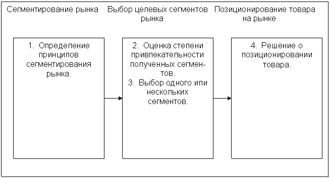 На данном этапе мы прибегаем к целевому маркетингу, т.е. производим разграничения между сегментами рынка которые в основном будем обслуживать, это требует проведения трех основных мероприятий (рисунок № 17).