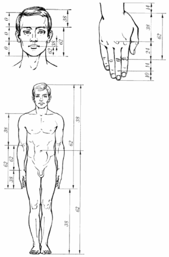 Цейзинг проделал колоссальную работу. Он измерил около двух тысяч человеческих тел и пришел к выводу, что золотое сечение выражает средний статистический закон. Деление тела точкой пупа - важнейший показатель золотого сечения. Пропорции мужского тела колеблются в пределах среднего отношения 13 : 8 = 1,625 и несколько ближе подходят к золотому сечению, чем пропорции женского тела, в отношении которого среднее значение пропорции выражается в соотношении 8 : 5 = 1,6. У новорожденного пропорция составляет отношение 1 : 1, к 13 годам она равна 1,6, а к 21 году равняется мужской. Пропорции золотого сечения проявляются и в отношении других частей тела - длина плеча, предплечья и кисти, кисти и пальцев и т.д.
