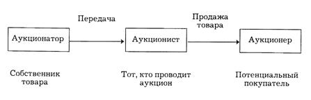 Аукционная форма торговли также относится к категории посреднических операций. В осуществлении таких операций участвуют три субъекта взаимоотношений (рис.5).