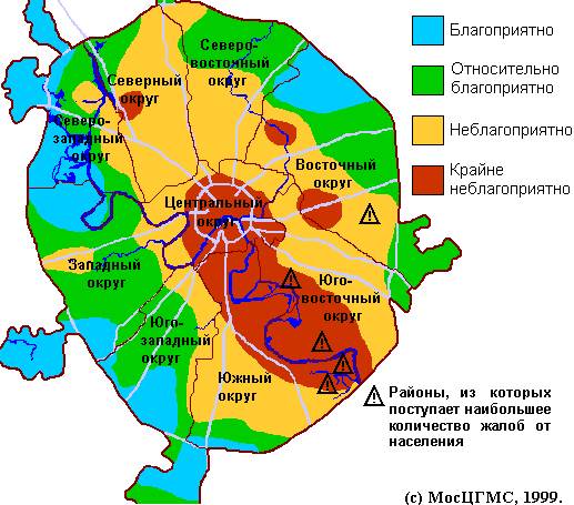 В центре города основное влияние на экологию оказывает автотранспорт (80% загрязнения в пределах Садового кольца). Также сильное загрязнение от автотранспорта ощущается вдоль крупных автомагистралей (50-250 метров, в зависимости от застройки и зеленых насаждений). Промышленные предприятия расположены в основном на юго-востоке (вдоль Москвы-реки) и на востоке города. Самые чистые районы - Ясенево, Крылатское, Строгино, район метро Юго-Западная, а также за пределами кольцевой дороги - Митино, Солнцево. Самые грязные - Марьино, Братеево, Люблино, районы внутри Садового кольца.