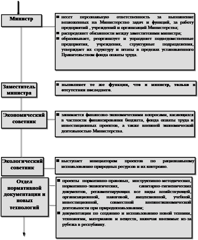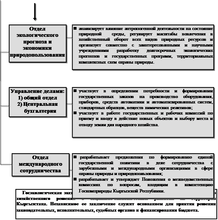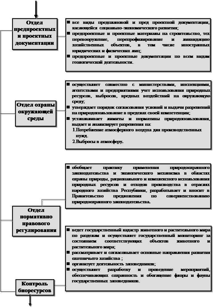 Этот орган управления подразделяется на такие отделы, как отдел охраны среды, отдел контроля биоресурсов и отдел нормативно-правового регулирования, можно поставить целью сбор и обработку информации, которая затем поступает в центральный аппарат и является неотъемлемой частью принятия решения с помощью сети компьютерных средств. Это позволяет вести учет использования природных ресурсов, выбросов, сбросов, загрязняющих веществ, вредных воздействий на окружающую среду и их источников, причем можно обеспечить постоянное обновление информации, данных о состоянии окружающей среды, количества биоресурсов, не только по областям Республики, но и по ее районам, с тем, чтобы осуществлять соответствующий контроль и регулирование деятельности данной структуры управления. Также использование информационных средств в этой сфере дает возможность связи с другими ведомственными структурами при необходимости получения или даче рекомендаций в отношении совместной деятельности по инспектированию и контролю. Также появится возможность сравнения аналогичной ситуации Кыргызстана с другими республиками, так как только совместная деятельность может привести к положительным результатам работы. Причем, как это уже было сказано выше, использование ИС намного облегчит как работу сотрудников Главного контрольно-инспекционного управления, так и сотрудников всего Министерства охраны природы.