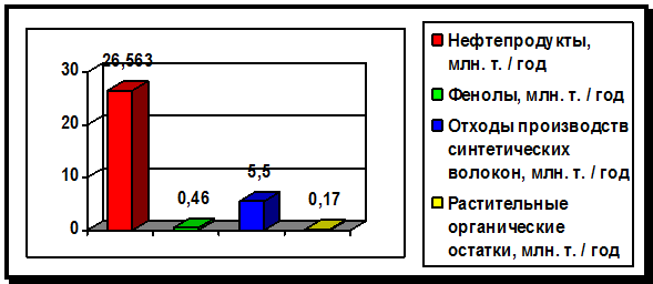 Среди вносимых в океан с суши растворимых веществ, большое значение для обитателей водной среды имеют не только минеральные, биогенные элементы, но и органические остатки.Вынос в океан органического вещества оценивается в 300 - 380 млн.т./год.Сточные воды, содержащие суспензии органического происхождения или растворенное органическое вещество, пагубно влияют на состояние водоемов.Осаждаясь, суспензии заливают дно и задерживают развитие или полностью прекращают жизнедеятельность данных микроорганизмов, участвующих в процессе самоочищения вод. При гниении данных осадков могут образовываться вредные соединения и отравляющие вещества, такие как сероводород, которые приводят к загрязнению всей воды в реке. Наличие суспензий затрудняют также проникновение света в глубь воды и замедляет процессы фотосинтеза. Одним из основных санитарных требований, предъявляемых к качеству воды, является содержание в ней необходимого количества кислорода. Вредное действие оказывают все загрязнения, которые так или иначе содействуют снижению содержания кислорода в воде .Поверхностно активные вещества - жиры, масла, смазочные материалы- образуют на поверхности воды пленку, которая препятствует газообмену между водой и атмосферой, что снижает степень насыщенности воды кислородом. Значительный объем органических веществ, большинство из которых не свойственно природным водам, сбрасывается в реки вместе с промышленными и бытовыми стоками. Нарастающее загрязнение водоемов и водостоков наблюдается во всех промышленных странах. Информация о содержании некоторых органических веществ в промышленных сточных водах предоставлена на рисунке 3.