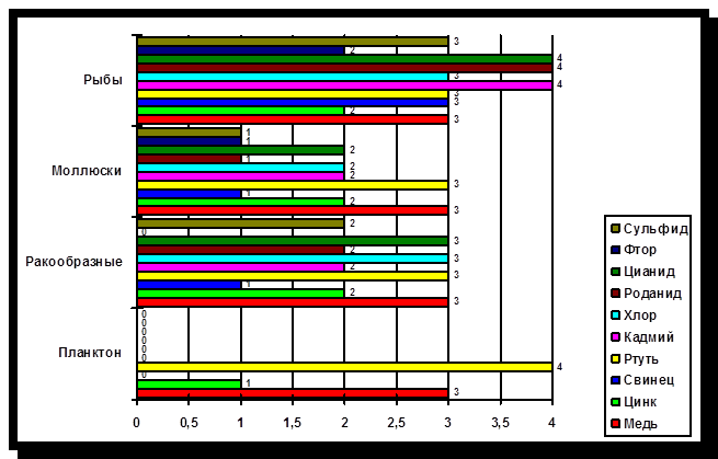 Основными неорганическими (минеральными) загрязнителями пресных и морских вод являются разнообразные химические соединения, токсичные для обитателей водной среды. Это соединения мышьяка, свинца, кадмия, ртути, хрома, меди, фтора. Большинство из них попадает в воду в результате человеческой деятельности. Тяжелые металлы поглощаются фитопланктоном, а затем передаются по пищевой цепи более высокоорганизованным организмам. Токсический эффект некоторых наиболее распространенных загрязнителей гидросферы представлен на рисунке 2: