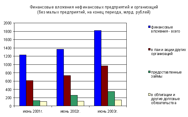 В середине 2003г. объемы осуществленных предприятиями финансовых вложений и предоставленных предприятиям банковских кредитов были приблизительно одинаковыми – около 1,8 трлн. рублей. Это означает, что банковское кредитование играет в развитии предприятий не большую роль, чем их перекрестное финансирование.