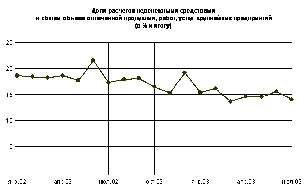 Рынок векселей также увеличивается. В частности, объем векселей, учтенных банками, за год возрос почти в 1,5 раза. Цивилизованные формы расчетов постепенно вытесняют всевозможные суррогаты. Так, расчеты неденежными средствами сейчас составляют 14% всего объема расчетов крупнейших предприятий против 17,3% в прошлом году (см. график 3). В порядке взаимного зачета требований проводится 7% всех расчетов, а векселями – 4,5% (в 2002 г. было соответственно 7,6% и 6,3%).