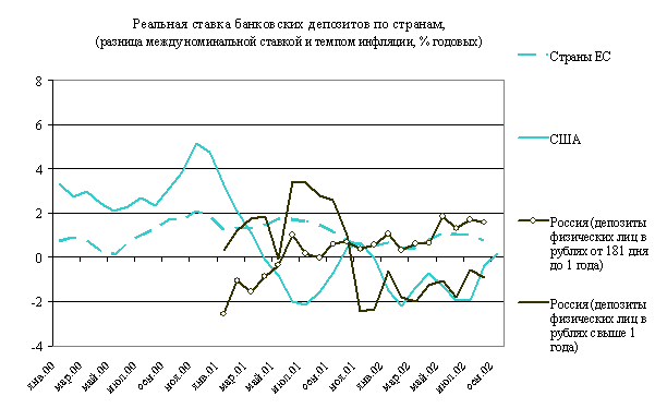 Расширение масштабного долгосрочного кредитования отчасти сдерживается сохранением высоких темпов инфляции. Одной из причин недостаточного объема долгосрочных ресурсов, аккумулированных банками, являются отрицательные реальные процентные ставки по долгосрочным депозитам (см. график 5).