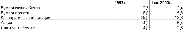 В странах с развитым финансовым рынком доля страховых компаний, занимающихся страхованием жизни, в общем объеме основных видов финансовых активов значительно выше. Так, в США их доля в корпоративных облигациях составляет около четверти (см. таблицу 3).