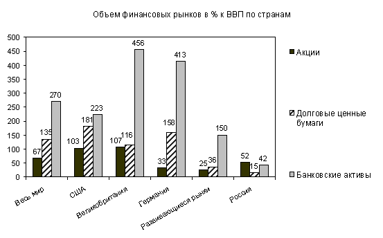 - по соотношению объема банковских активов и ВВП Россия существенно (более чем в 10 раз) отстает от развитых финансовых рынков;