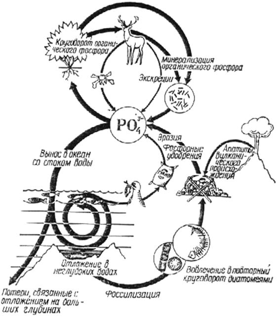 На поверхности суши протекает интенсивный круговорот фосфора в системе почва → растения → животные → почва. В связи с тем, что минеральные соединения фосфора труднорастворимы и содержащийся в них элемент почти недоступен растениям, последние преимущественно используют его легкорастворимые формы, образующиеся при разложении органических остатков. Круговорот фосфора происходит и в системе суша → Мировой океан, основой которого является вынос фосфатов с речным стоком, взаимодействие их с кальцием, образование фосфоритов, залежи которых со временем выходят на поверхность и снова включаются в миграционные процессы.