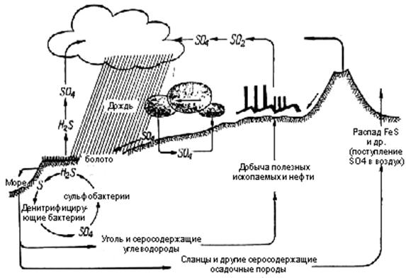 На круговоротах азота и серы все больше сказывается промышленное загрязнение воздуха. Сжигание ископаемого топлива значительно увеличило содержание летучих окислов азота (NO и NO2) и серы (SO2) в воздухе, особенно в городах; концентрации их уже становятся опасными для биотических компонентов экосистем.