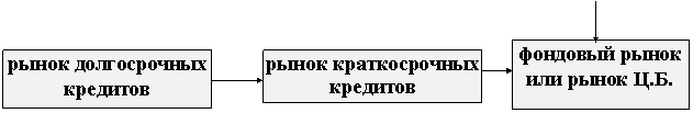 Как известно, рынок - это система экономических отношений, позволяющая эффективно функционировать отраслям народного хозяйства на основе спроса, предложения и их балансирующей цены. Рынок это форма связи производства с потребителем, а также совокупность всех существующих и потенциальных продавцов, покупателей товаров и услуг. В узком смысле рынок представляет собой сферу непроизводственного, товарного и денежного обращения. Рыночная экономика современного государства состоит из множества рынков, которые, в свою очередь подразделяются на более мелкие сегменты. Особое место в системе экономических отношений занимает финансовый рынок или рынок капиталов. Рынок капиталов - подразделяется на три составные части: рынок краткосрочного кредита, то есть денежный рынок, на котором обращаются коммерческие, финансовые и казначейские векселя, рынок долгосрочного денежного кредита (облигационный рынок) и рынок фиктивного капитала или рынок ценных бумаг (схема 3).