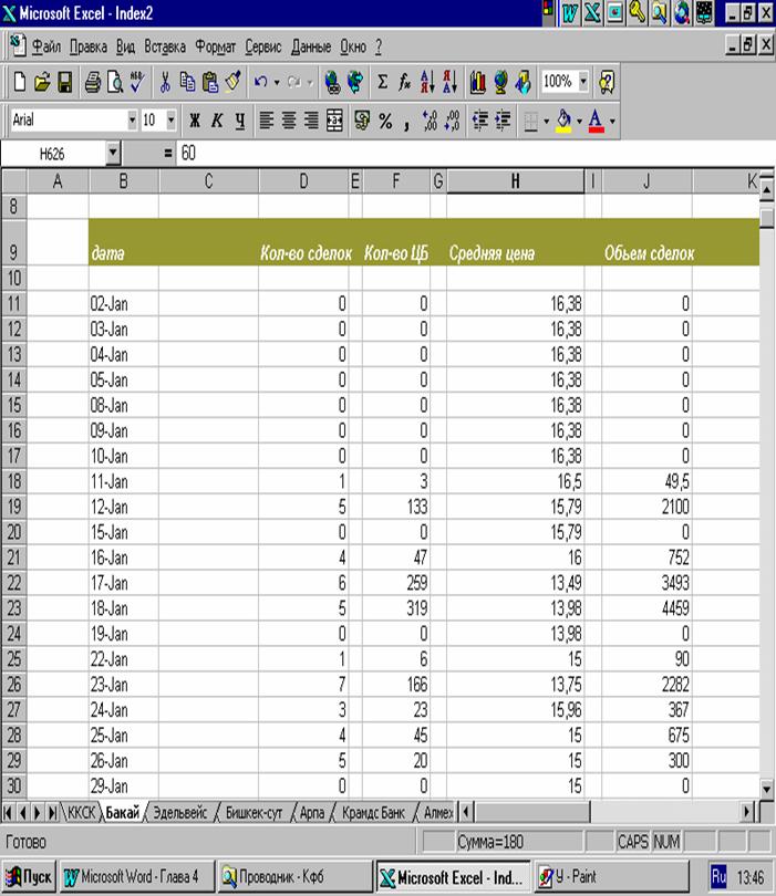 Для расчёта индекса нами была разработана программа по расчёту индекса, автоматизирующая данную процедуру. Для выполнения задачи необходимы следующие исходные данные: количество сделок, количество ценных бумаг, средняя цена, объем сделок и дата. Эти данные представлены в системе EXCEL (Табл. 5) следующим образом: