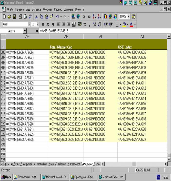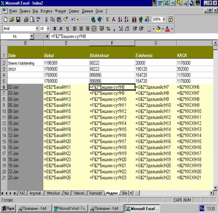 Следующая таблица EXCEL (Табл. 6) позволяет расчитывать капитализацию компаний, входящих в котировальный реестр КФБ. При этом из таблицы 5 берётся значение средней цены акции (рыночная цена) и умножается на количество простых акций.
