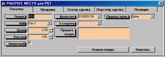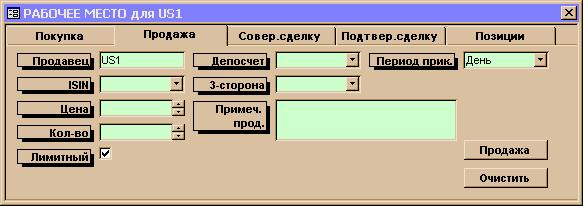 Ввод информации аналогичен в основном вводу информации в формах Продажи/Покупки. Единственное различие состоит в том, что код продавца/ покупателя вводится вручную. Если Вы ввели код другого брокера, Вашего партнера по сделке, то Ваш код система введет автоматически. Система не позволит ввести сделку, где продавец и покупатель является одним и тем же лицом! Система позволяет ввести дополнительные специальные комиссионные для продавца или покупателя.