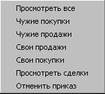Для того, чтобы удалить введенный, но еще не подобранный приказ необходимо выбрать данный приказ в окне «Информация по торгам» в форме «Покупка» или «Продажа», отметить его курсором и вызвать всплывающее меню нажатием правой кнопки мыши. Выбрать строку «Отменить приказ» в меню, после этого появится окно, аналогичное окну ввода приказа. Необходимо подтвердить отмену приказа покупки/продажи, нажав кнопку «Отмена покупки/продажи».