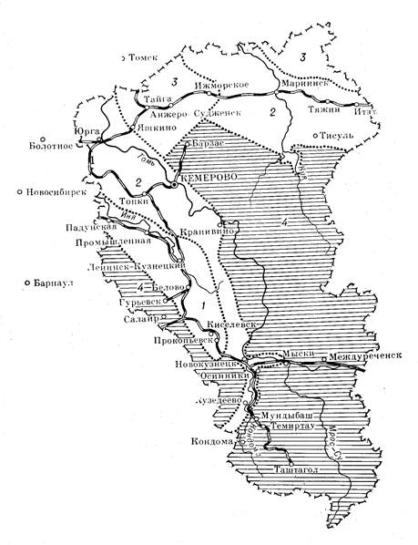 Среднегодовая температура составляет от +1,2° (Подкатунь-Грива) до —1,4 (Усть-Кабырза). Средняя температура января колеблется от —17 (Есаулка) до —19,5° (Крапивино, Междуреченск). Морозы могут достигать —45 (Подкатунь-Грива) и —57° (Крапивино). Расчетная температура самой холодной пятидневки от —35 (Центральный Рудник) до —42° (Усть-Кабырза). Средняя температура июля составляет от +16,2 (Шимзес, Темиртау) до 19,5° (Кузнецк). Летний максимум температуры воздуха равен от +35 (Междуреченск, Кузедеево, Подкатунь-Грива, Темиртау) до 38° (Кемерово, Крапивино, Кольчугино, Киселевск, Новокузнецк и др.). Средняя продолжительность безморозного периода колеблется от 93 (Амзас) до 128 дней (Есаулка, Подкатунь-Грива), а максимальная продолжительность— от 116 (Амзас) до 158 дней (Новокузнецк).