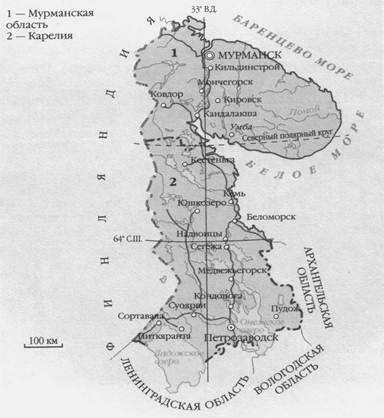 Крайний северо-запад России занимают Мурманская область (площадь – 144,9 тыс. км2) и Республика Карелия (площадь – 172,4 тыс. км2). Западные пределы двух этих регионов совпадают с Государственной границей России с Финляндией и Норвегией. Мурманскую область и Карелию разделяет Северный полярный круг – лишь кое-где административная граница отступает от “географической”.
