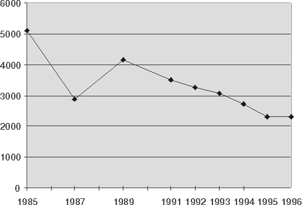 Рис.4. Изменение % людей в группе "норма", имеющих отклонения, по годам