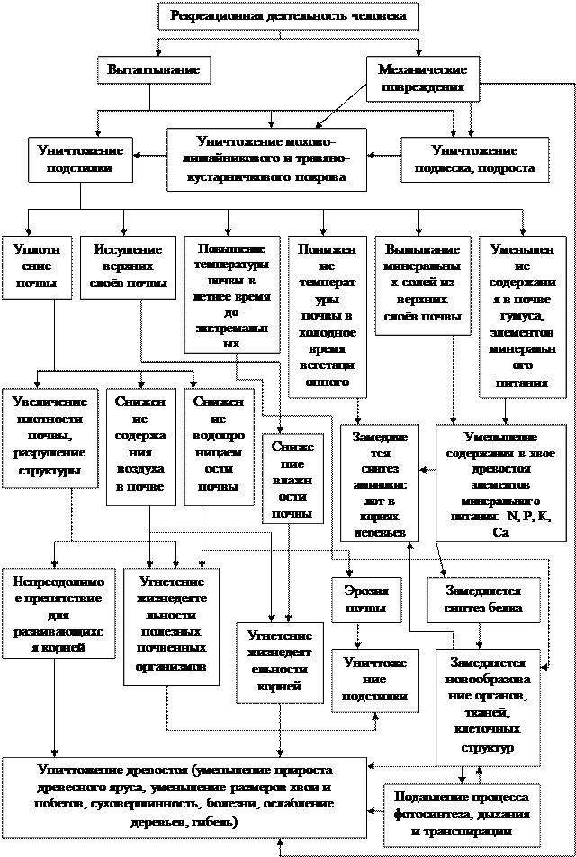 Присутствие даже одного человека не проходит для леса бесследно. Сбор грибов, цветов и ягод подрывает самовозобновление ряда видов растений. Костёр на 5-7 лет полностью выводит из строя клочок земли, на котором он был разложен. Шум отпугивает различных птиц и млекопитающих, мешает им нормально растить потомство. Обламывание ветвей, зарубки на стволах и другие механические повреждения деревьев способствуют заражению их насекомыми-вредителями.