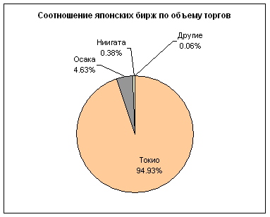 Крупнейшим рынком в Японии является Токийская фондовая биржа, на которую приходится примерно 95% оборота по акциям. Крупной биржей является также Осакская фондовая биржа. На остальные 6 фондовых бирж приходится несколько процентов всего оборота. Процентное соотношение японских бирж представлено на Рис. 1