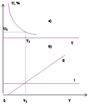 Как все это связанно с безработицей? На рис.9 а представлена кривая, связывающая уровень безработицы U (в процентах) с уровнем национального дохода Y (в долларах), которую можно рассматривать как приемлемую модель такой связи в краткосрочном плане. Она просто отражает тот очевидный факт, что чем больше будет производиться товаров и услуг, тем больше для их производства потребуется ресурсов, включая рабочую силу, а следовательно уровень безработицы падает, если национальный доход растет. Согласно «классической» точке зрения (чистые рыночники), экономика будет стремиться к равновесному состоянию, которое соответствует минимальному уровню безработицы U в результате того, что с ростом национального дохода реальная зарплата будет снижаться до своего равновесного значения на всех рынках труда. По Кейнсу же, и в этом состоит один из главных моментов его теории, равновесный уровень национального дохода (Y1 на рис.9 b) , то есть макроэкономическое равновесие, соответствует условию равенства инвестиций I сбережениям S. При этом полная занятость может и не достигаться, либо потому, что «частники» слишком много откладывают (потребляют слишком мало), либо потому, что «фирмы» не имеют необходимых стимулов для достаточных инвестиций в производство, обеспечивающее полную занятость.