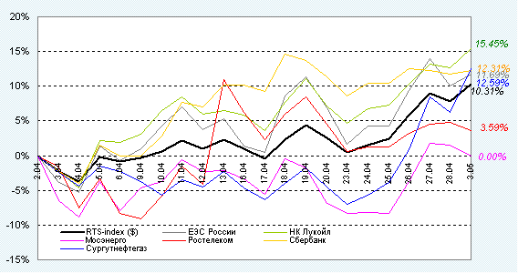 Динамика котировок наиболее ликвидных ценных бумаг в РТС