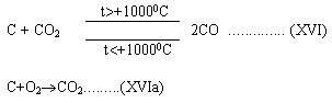 Процессы (XVI) и (XVIа) протекают при взаимодействии воздуха с раскаленным углеродом. В результате получается смесь СО+N2, т.е. образуется генераторный газ. В итоге в отходящих газах из реактора содержится водяной газ: СО+Н2 и генераторный газ СО+N2. Синтез аммиака из газообразных N2 и Н2 не происходит, т.к. этот процесс может происходить при низких температурах и при высоком давлении. При высоких температурах происходит разложение ОХИТ: