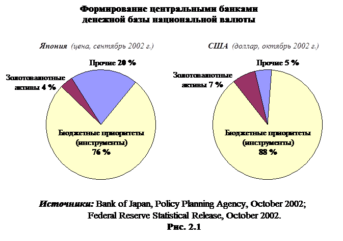 На рисунке 2.1 показаны основные каналы формирования ресурсной базы японской иены и доллара США, которые используются соответственно Банком Японии и Федеральной резервной системой (ФРС) США. Денежная база, данные о которой приводятся на рисунке, является показателем, фактически отражающим величину всей эмиссии японских иен и американских долларов, имеющих в настоящее время хождение в мире. Почти на 80% Банк Японии формирует ресурсы под бюджетные задачи — об этом свидетельствует величина государственных ценных бумаг, находящихся на балансе Банка Японии, под которые он эмитировал иены.