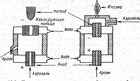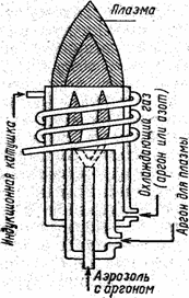 В горящую дугу вводят аэрозоль анализируемого раствора. Вихреобразные струи инертного газа охлаждают снаружи облако разряда и выносят образуемую плазму через отверстие в катоде в виде светящейся струи длиной 10 15 мм. По мере увеличения скорости потока через выходное отверстие возрастает электропроводность струй, что приводит к повышению плотности тока и увеличению температуры в шнуре разряда (термический пинч-эффект). При больших токах происходит еще дополнительное сжатие плазмы в результате действия сил магнитного давления (электрический пинч-эффект). Ток, текущий в том же направлении, что и газ заставляет ионы взаимно притягиваться, что приводят к дальнейшему повышению температуры магнитогидродинамическими силами.