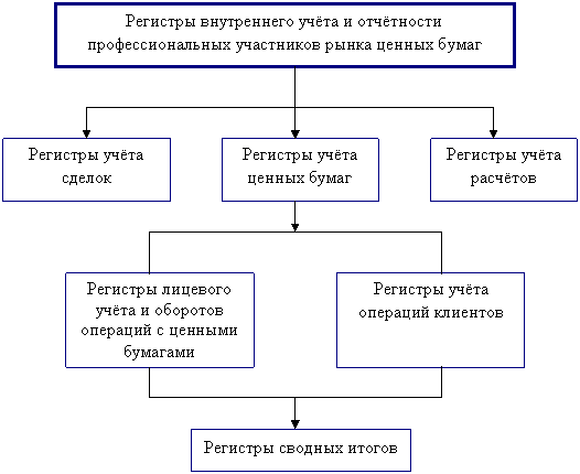 Регистры внутреннего учёта, представленные на схеме, предусматривают формирование полной и доставерной информации о сделках с ценными бумагами. Причём особое внимание привлекает регистр учёта ценных бумаг, который аккумулирует информацию регистров лицевого учёта и оборотов операций с ценными бумагами самого профессионального участника рынка ценных бумаг и регистра учёта сделок клиентов. Информация данных регистров впоследствии концентрируется в регистре сводных итогов, заносимая в хронологическом порядке.