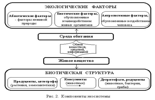 1) экосистема обязательно представляет собой совокупность живых и неживых компонентов (рис. 2);