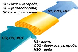 В результате токсичные соединения CO, CH и NOx окисляются или восстанавливаются до углекислого газа СО2, азота N2 и воды Н2О (рис.3).