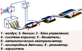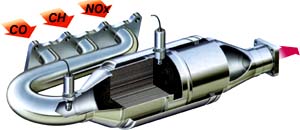 На рис.7 изображен современный трехкомпонентный каталитический нейтрализатор. Второй кислородный датчик нужен для новейших систем бортовой диагностики OBD-II и отслеживает эффективность нейтрализации.
