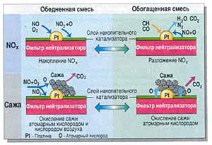 "Тойота" разработала свою, не менее эффективную систему очистки, названную DPNR (рис.14). Она одновременно обезвреживает и канцерогенные частицы сажи, и просто вредные окислы азота (о СН и СО сегодня говорить уже стыдно – пройденный этап). Главную роль играет новый микропористый керамический фильтр, покрытый слоем накапливающего азот материала и катализатором на основе платины. Во время работы двигателя на бедной смеси частицы сажи окисляются атомарным кислородом, освобождающимся при соединении NO и О2 из выхлопных газов в процессе накопления NO2.