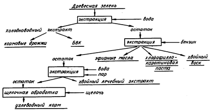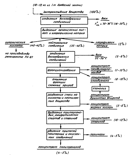 Рис. 9. Принципиальная схема переработки экстрактивных веществ древесной зелени сосны обыкновенной