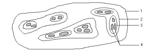 1- ареал вида; 2- географическая популяция; 3- экологическая, или местная популяция; 4- микропопуляция (элементарная)